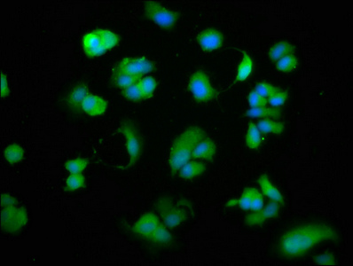 Immunofluorescence staining of MCF-7 cells with CSB-PA08235A0Rb at 1:266, counter-stained with DAPI. The cells were fixed in 4% formaldehyde, permeabilized using 0.2% Triton X-100 and blocked in 10% normal Goat Serum. The cells were then incubated with the antibody overnight at 4°C. The secondary antibody was Alexa Fluor 488-congugated AffiniPure Goat Anti-Rabbit IgG(H+L).