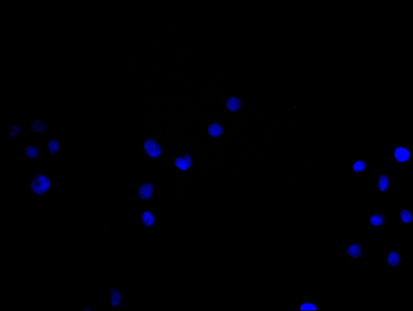 Immunofluorescence staining of Hela cell with 5% goat serum, counter-stained with DAPI. The cells were fixed in 4% formaldehyde and blocked in 10% normal Goat Serum. The cells were then incubated with the antibody overnight at 4C. The secondary antibody was Alexa Fluor 488-congugated AffiniPure Goat Anti-Rabbit IgG(H+L).