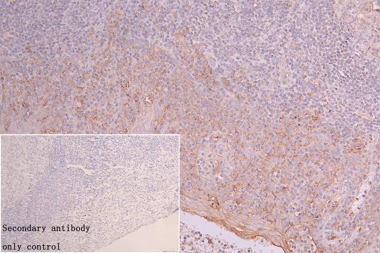 IHC image of CSB-PA10559A0Rb diluted at 1:400 and staining in paraffin-embedded human tonsil tissue performed on a Leica BondTM system. After dewaxing and hydration, antigen retrieval was mediated by high pressure in a citrate buffer (pH 6.0). Section was blocked with 10% normal goat serum 30min at RT. Then primary antibody (1% BSA) was incubated at 4°C overnight. The primary is detected by a Goat anti-rabbit polymer IgG labeled by HRP and visualized using 0.05% DAB. Secondary antibody only control: uses 1% BSA instead of primary antibody