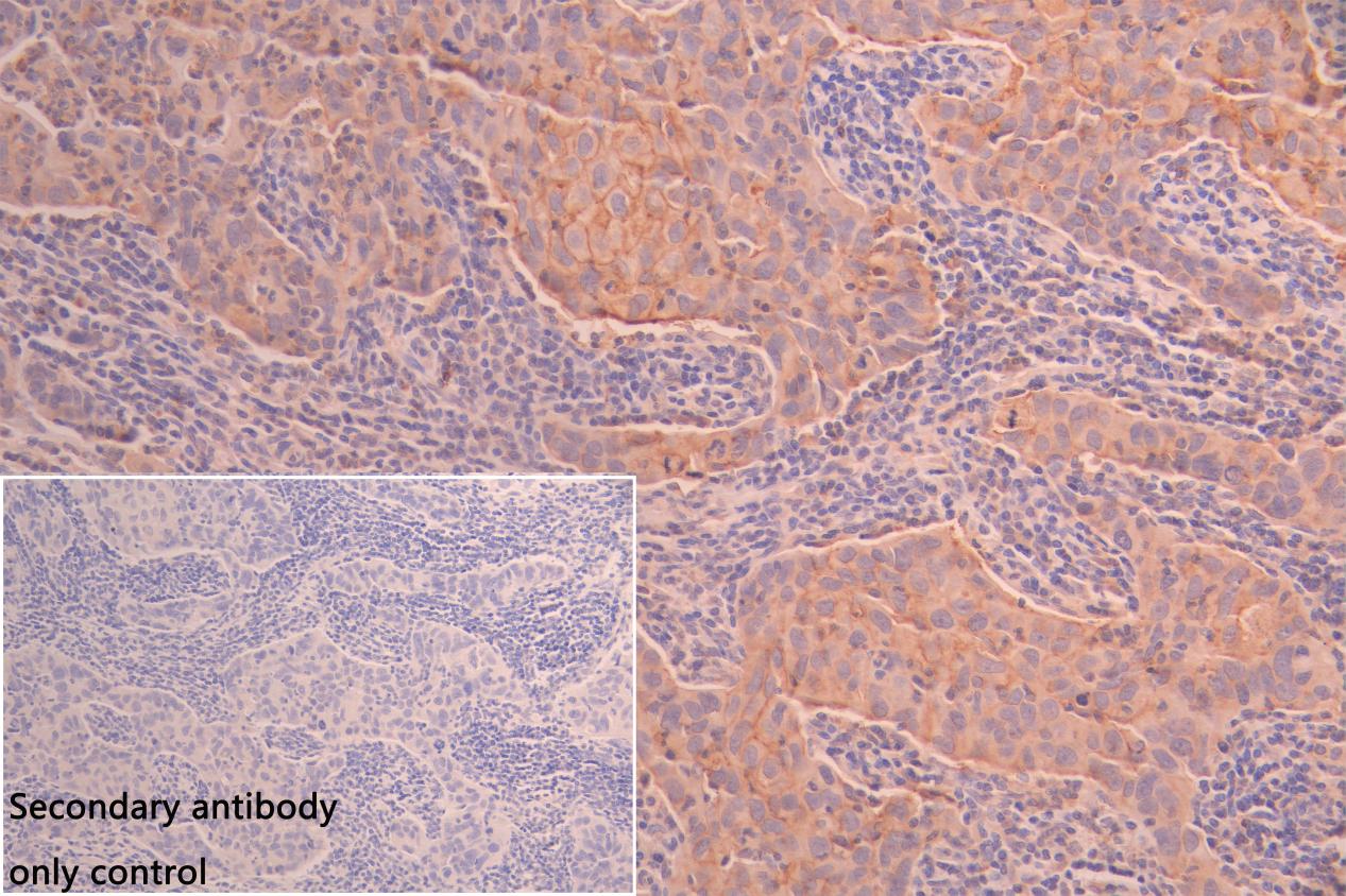 IHC image of CSB-PA10559A0Rb diluted at 1:400 and staining in paraffin-embedded human bladder cancer performed on a Leica BondTM system. After dewaxing and hydration, antigen retrieval was mediated by high pressure in a citrate buffer (pH 6.0). Section was blocked with 10% normal goat serum 30min at RT. Then primary antibody (1% BSA) was incubated at 4°C overnight. The primary is detected by a Goat anti-rabbit polymer IgG labeled by HRP and visualized using 0.05% DAB. Secondary antibody only control: uses 1% BSA instead of primary antibody