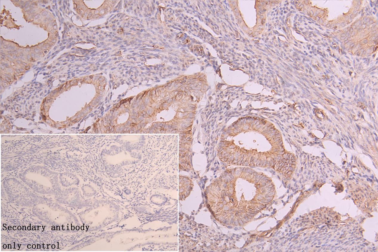 IHC image of CSB-PA10559A0Rb diluted at 1:400 and staining in paraffin-embedded human endometrial cancer performed on a Leica BondTM system. After dewaxing and hydration, antigen retrieval was mediated by high pressure in a citrate buffer (pH 6.0). Section was blocked with 10% normal goat serum 30min at RT. Then primary antibody (1% BSA) was incubated at 4°C overnight. The primary is detected by a Goat anti-rabbit polymer IgG labeled by HRP and visualized using 0.05% DAB. Secondary antibody only control: uses 1% BSA instead of primary antibody