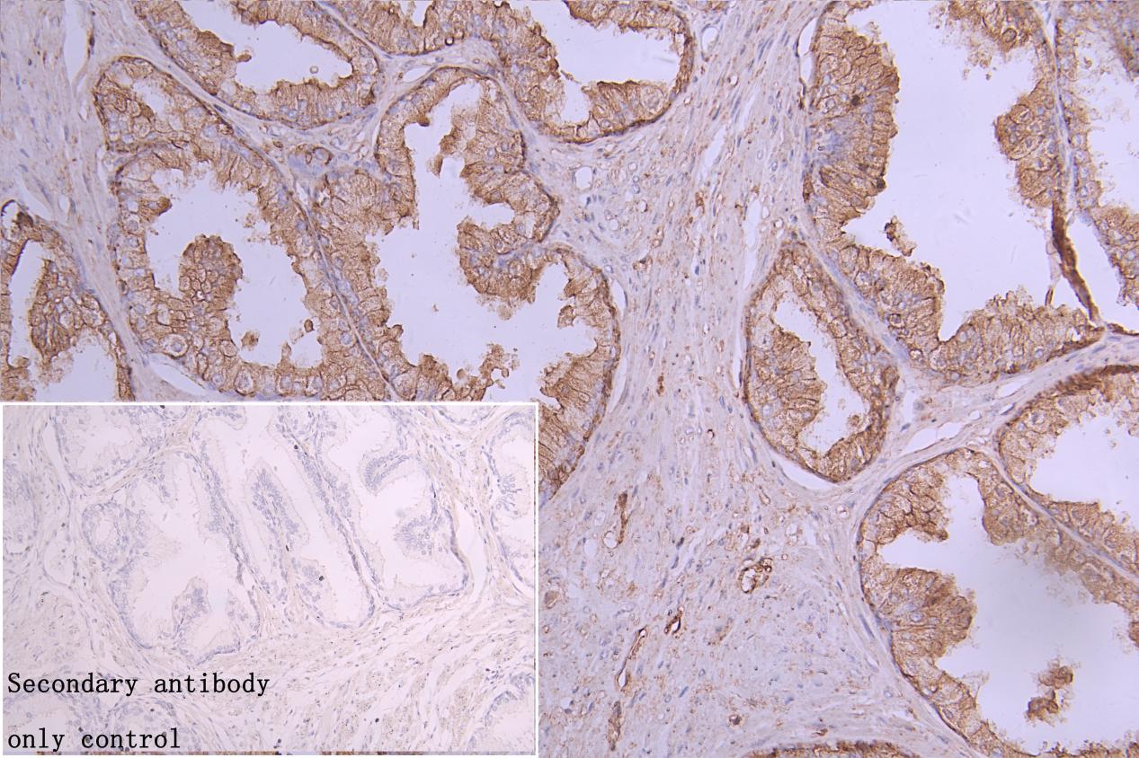 IHC image of CSB-PA10559A0Rb diluted at 1:400 and staining in paraffin-embedded human prostate cancer performed on a Leica BondTM system. After dewaxing and hydration, antigen retrieval was mediated by high pressure in a citrate buffer (pH 6.0). Section was blocked with 10% normal goat serum 30min at RT. Then primary antibody (1% BSA) was incubated at 4°C overnight. The primary is detected by a Goat anti-rabbit polymer IgG labeled by HRP and visualized using 0.05% DAB. Secondary antibody only control: uses 1% BSA instead of primary antibody