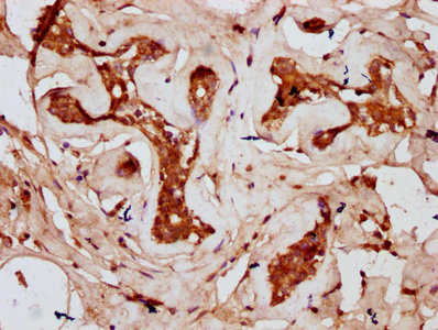 IHC image of CSB-PA810285LA01HU diluted at 1:300 and staining in paraffin-embedded human breast cancer performed on a Leica BondTM system. After dewaxing and hydration, antigen retrieval was mediated by high pressure in a citrate buffer (pH 6.0). Section was blocked with 10% normal goat serum 30min at RT. Then primary antibody (1% BSA) was incubated at 4°C overnight. The primary is detected by a biotinylated secondary antibody and visualized using an HRP conjugated SP system.