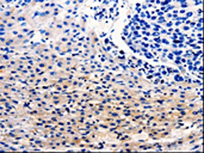 The image on the left is immunohistochemistry of paraffin-embedded Human liver cancer tissue using CSB-PA153558(CDC20 Antibody) at dilution 1/25, on the right is treated with fusion protein. (Original magnification: ×200)