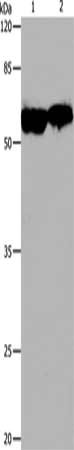 Gel: 10%SDS-PAGE, Lysate: 30 μg, Lane 1-2: 293T cells, Human cervical cancer tissue, Primary antibody: CSB-PA153558(CDC20 Antibody) at dilution 1/600, Secondary antibody: Goat anti rabbit IgG at 1/8000 dilution, Exposure time: 30 seconds