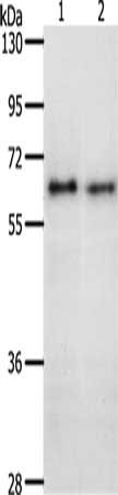 Gel: 10%SDS-PAGE, Lysate: 40 μg, Lane 1-2: K562 cells, 293T cells, Primary antibody: CSB-PA870444(CDC6 Antibody) at dilution 1/400, Secondary antibody: Goat anti rabbit IgG at 1/8000 dilution, Exposure time: 2 minutes