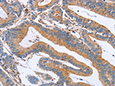 The image on the left is immunohistochemistry of paraffin-embedded Human colon cancer tissue using CSB-PA039310(CDC7 Antibody) at dilution 1/70, on the right is treated with synthetic peptide. (Original magnification: ×200)