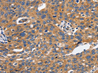 The image on the left is immunohistochemistry of paraffin-embedded Human ovarian cancer tissue using CSB-PA164023(CDH1 Antibody) at dilution 1/100, on the right is treated with synthetic peptide. (Original magnification: ×200)