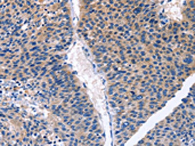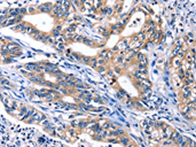 The image on the left is immunohistochemistry of paraffin-embedded Human gastric cancer tissue using CSB-PA125315(CDK2 Antibody) at dilution 1/30, on the right is treated with fusion protein. (Original magnification: ×200)