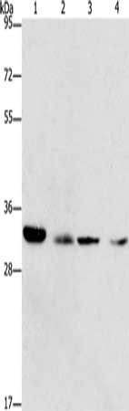 Gel: 8%SDS-PAGE, Lysate: 40 μg, Lane 1-4: 231 cells, NIH/3T3 cells, hela cells, human fetal liver tissue, Primary antibody: CSB-PA125315(CDK2 Antibody) at dilution 1/275, Secondary antibody: Goat anti rabbit IgG at 1/8000 dilution, Exposure time: 1 minute