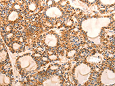 The image on the left is immunohistochemistry of paraffin-embedded Human thyroid cancer tissue using CSB-PA193428(CDKN1C Antibody) at dilution 1/15, on the right is treated with synthetic peptide. (Original magnification: ×200)