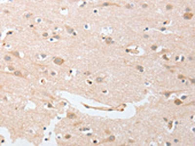 The image on the left is immunohistochemistry of paraffin-embedded Human brain tissue using CSB-PA644111(CDKN2C Antibody) at dilution 1/25, on the right is treated with fusion protein. (Original magnification: ×200)