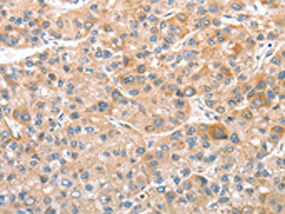 The image on the left is immunohistochemistry of paraffin-embedded Human liver cancer tissue using CSB-PA283856(CDR2 Antibody) at dilution 1/30, on the right is treated with fusion protein. (Original magnification: ×200)
