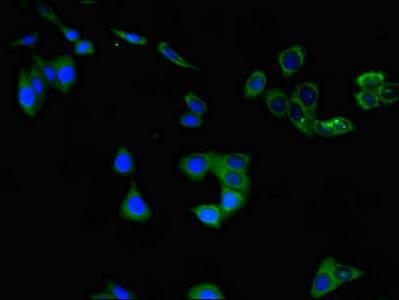 Immunofluorescent analysis of HepG2 cells using CSB-PA005314LA01HU at dilution of 1:100 and Alexa Fluor 488-congugated AffiniPure Goat Anti-Rabbit IgG(H+L)
