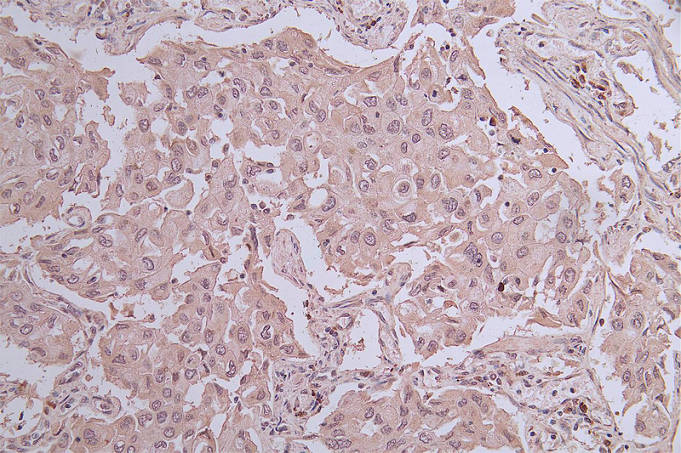 IHC image of CSB-PA005314LA01HU diluted at 1:100 and staining in paraffin-embedded human endometrial cancer performed on a Leica BondTM system. After dewaxing and hydration, antigen retrieval was mediated by high pressure in a citrate buffer (pH 6.0). Section was blocked with 10% normal goat serum 30min at RT. Then primary antibody (1% BSA) was incubated at 4°C overnight. The primary is detected by a Goat anti-rabbit polymer IgG labeled by HRP and visualized using 0.05% DAB.