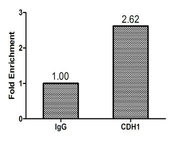 Chromatin Immunoprecipitation Hela (1.1*106) were cross-linked with formaldehyde, sonicated, and immunoprecipitated with 4μg anti-CDH1 or a control normal rabbit IgG. The resulting ChIP DNA was quantified tissue using real-time PCR with primers (CSB-PP005325HU) against the RPL30 promoter.