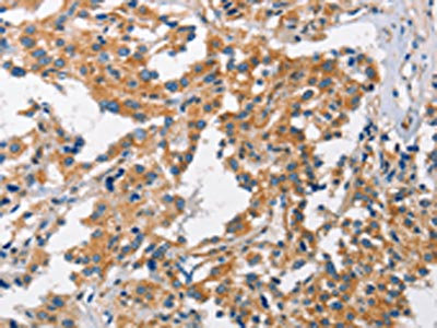 The image on the left is immunohistochemistry of paraffin-embedded Human gastric cancer tissue using CSB-PA116460(CHMP1A Antibody) at dilution 1/60, on the right is treated with fusion protein. (Original magnification: ×200)