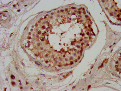 IHC image of CSB-PA881032LA01HU diluted at 1:200 and staining in paraffin-embedded human testis tissue performed on a Leica BondTM system. After dewaxing and hydration, antigen retrieval was mediated by high pressure in a citrate buffer (pH 6.0). Section was blocked with 10% normal goat serum 30min at RT. Then primary antibody (1% BSA) was incubated at 4°C overnight. The primary is detected by a biotinylated secondary antibody and visualized using an HRP conjugated SP system.