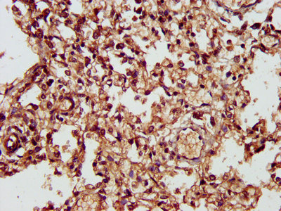 IHC image of CSB-PA882066LA01HU diluted at 1:300 and staining in paraffin-embedded human lung tissue performed on a Leica BondTM system. After dewaxing and hydration, antigen retrieval was mediated by high pressure in a citrate buffer (pH 6.0). Section was blocked with 10% normal goat serum 30min at RT. Then primary antibody (1% BSA) was incubated at 4°C overnight. The primary is detected by a biotinylated secondary antibody and visualized using an HRP conjugated SP system.