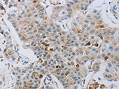 The image on the left is immunohistochemistry of paraffin-embedded Human breast cancer tissue using CSB-PA247166(CKMT1A/CKMT1B Antibody) at dilution 1/100, on the right is treated with synthetic peptide. (Original magnification: ×200)