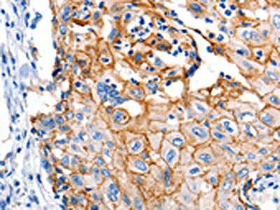 The image on the left is immunohistochemistry of paraffin-embedded Human esophagus cancer tissue using CSB-PA983237(CLDN1 Antibody) at dilution 1/150, on the right is treated with synthetic peptide. (Original magnification: ×200)