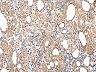 The image on the left is immunohistochemistry of paraffin-embedded Human thyroid cancer tissue using CSB-PA117475(CLU Antibody) at dilution 1/20, on the right is treated with synthetic peptide. (Original magnification: ×200)