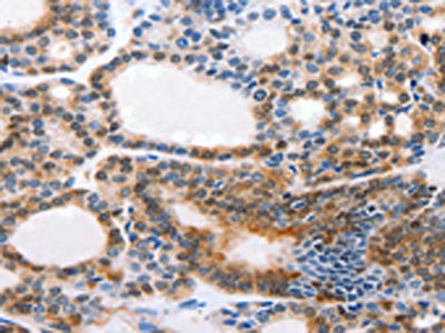 The image on the left is immunohistochemistry of paraffin-embedded Human thyroid cancer tissue using CSB-PA597389(CMTM3 Antibody) at dilution 1/20, on the right is treated with synthetic peptide. (Original magnification: ×200)