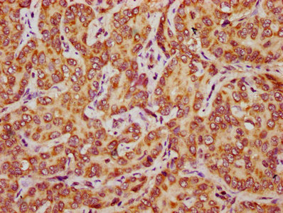 IHC image of CSB-PA896698LA01HU diluted at 1:500 and staining in paraffin-embedded human liver cancer performed on a Leica BondTM system. After dewaxing and hydration, antigen retrieval was mediated by high pressure in a citrate buffer (pH 6.0). Section was blocked with 10% normal goat serum 30min at RT. Then primary antibody (1% BSA) was incubated at 4°C overnight. The primary is detected by a biotinylated secondary antibody and visualized using an HRP conjugated SP system.