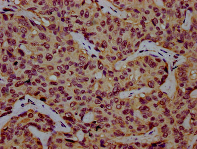 IHC image of CSB-PA846673LA01HU diluted at 1:100 and staining in paraffin-embedded human liver cancer performed on a Leica BondTM system. After dewaxing and hydration, antigen retrieval was mediated by high pressure in a citrate buffer (pH 6.0). Section was blocked with 10% normal goat serum 30min at RT. Then primary antibody (1% BSA) was incubated at 4°C overnight. The primary is detected by a biotinylated secondary antibody and visualized using an HRP conjugated SP system.