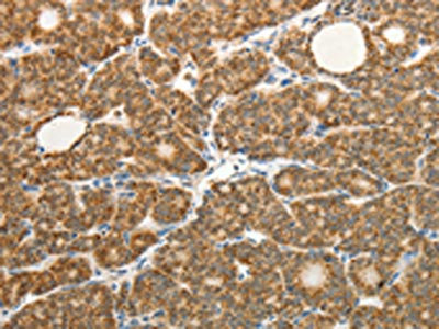 The image on the left is immunohistochemistry of paraffin-embedded Human thyroid cancer tissue using CSB-PA345280(COL4A3 Antibody) at dilution 1/20, on the right is treated with synthetic peptide. (Original magnification: ×200)