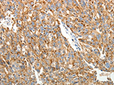 The image on the left is immunohistochemistry of paraffin-embedded Human ovarian cancer tissue using CSB-PA345280(COL4A3 Antibody) at dilution 1/20, on the right is treated with synthetic peptide. (Original magnification: ×200)