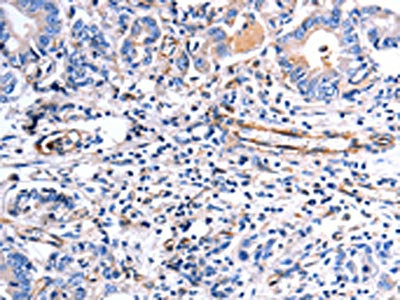 The image on the left is immunohistochemistry of paraffin-embedded Human stomach cancer tissue using CSB-PA277061(COX11 Antibody) at dilution 1/30, on the right is treated with fusion protein. (Original magnification: ×200)