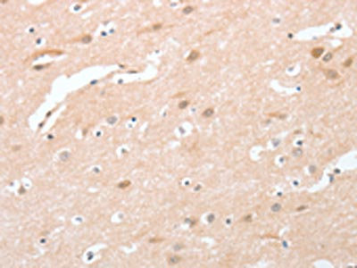 The image on the left is immunohistochemistry of paraffin-embedded Human brain tissue using CSB-PA282084(CPSF4 Antibody) at dilution 1/30, on the right is treated with fusion protein. (Original magnification: ×200)