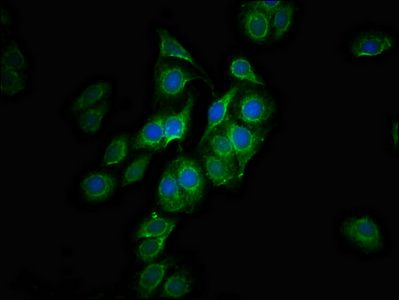 Immunofluorescence staining of HepG2 cells with CSB-PA719416LA01HU at 1:100, counter-stained with DAPI. The cells were fixed in 4% formaldehyde, permeabilized using 0.2% Triton X-100 and blocked in 10% normal Goat Serum. The cells were then incubated with the antibody overnight at 4°C. The secondary antibody was Alexa Fluor 488-congugated AffiniPure Goat Anti-Rabbit IgG(H+L).