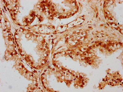 IHC image of CSB-PA719416LA01HU diluted at 1:300 and staining in paraffin-embedded human prostate cancer performed on a Leica BondTM system. After dewaxing and hydration, antigen retrieval was mediated by high pressure in a citrate buffer (pH 6.0). Section was blocked with 10% normal goat serum 30min at RT. Then primary antibody (1% BSA) was incubated at 4°C overnight. The primary is detected by a biotinylated secondary antibody and visualized using an HRP conjugated SP system.
