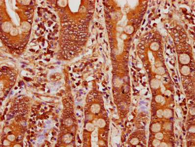 IHC image of CSB-PA719416LA01HU diluted at 1:300 and staining in paraffin-embedded human small intestine tissue performed on a Leica BondTM system. After dewaxing and hydration, antigen retrieval was mediated by high pressure in a citrate buffer (pH 6.0). Section was blocked with 10% normal goat serum 30min at RT. Then primary antibody (1% BSA) was incubated at 4°C overnight. The primary is detected by a biotinylated secondary antibody and visualized using an HRP conjugated SP system.