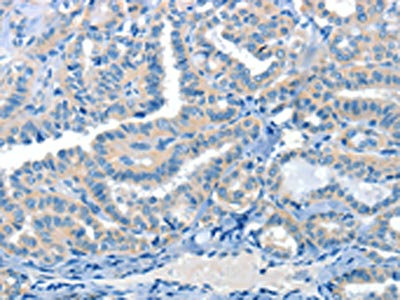 The image on the left is immunohistochemistry of paraffin-embedded Human thyroid cancer tissue using CSB-PA905549(CRLF2 Antibody) at dilution 1/60, on the right is treated with synthetic peptide. (Original magnification: ×200)