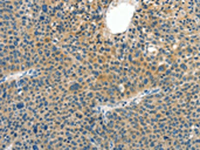 The image on the left is immunohistochemistry of paraffin-embedded Human liver cancer tissue using CSB-PA905549(CRLF2 Antibody) at dilution 1/60, on the right is treated with synthetic peptide. (Original magnification: ×200)