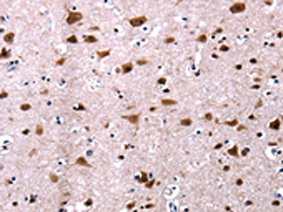 The image on the left is immunohistochemistry of paraffin-embedded Human brain tissue using CSB-PA276737(CSNK2A1 Antibody) at dilution 1/13, on the right is treated with fusion protein. (Original magnification: ×200)