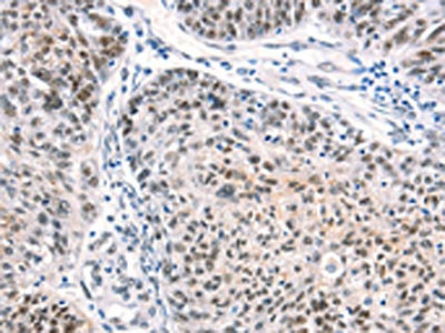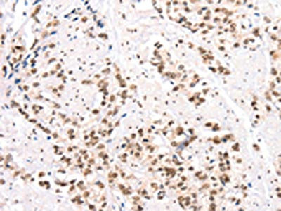 The image on the left is immunohistochemistry of paraffin-embedded Human prostate cancer tissue using CSB-PA549967(CTBP2 Antibody) at dilution 1/40, on the right is treated with synthetic peptide. (Original magnification: ×200)