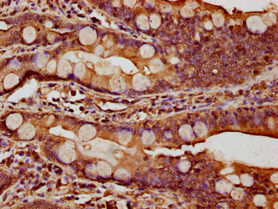 IHC image of CSB-PA006164EA01HU diluted at 1:1000 and staining in paraffin-embedded human small intestine tissue performed on a Leica BondTM system. After dewaxing and hydration, antigen retrieval was mediated by high pressure in a citrate buffer (pH 6.0). Section was blocked with 10% normal goat serum 30min at RT. Then primary antibody (1% BSA) was incubated at 4°C overnight. The primary is detected by a biotinylated secondary antibody and visualized using an HRP conjugated SP system.