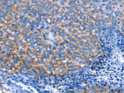 The image on the left is immunohistochemistry of paraffin-embedded Human ovarian cancer tissue using CSB-PA293996(CXCL3 Antibody) at dilution 1/25, on the right is treated with fusion protein. (Original magnification: ×200)