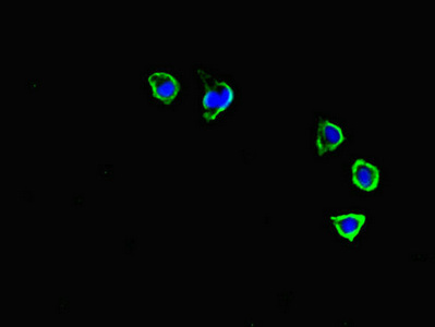 Immunofluorescence staining of HepG2 cells with CSB-PA006253LA01HU at 1:400, counter-stained with DAPI. The cells were fixed in 4% formaldehyde, permeabilized using 0.2% Triton X-100 and blocked in 10% normal Goat Serum. The cells were then incubated with the antibody overnight at 4°C. The secondary antibody was Alexa Fluor 488-congugated AffiniPure Goat Anti-Rabbit IgG(H+L).