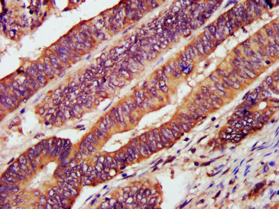 IHC image of CSB-PA006253LA01HU diluted at 1:1200 and staining in paraffin-embedded human colon cancer performed on a Leica BondTM system. After dewaxing and hydration, antigen retrieval was mediated by high pressure in a citrate buffer (pH 6.0). Section was blocked with 10% normal goat serum 30min at RT. Then primary antibody (1% BSA) was incubated at 4°C overnight. The primary is detected by a biotinylated secondary antibody and visualized using an HRP conjugated SP system.