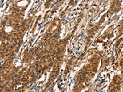 The image on the left is immunohistochemistry of paraffin-embedded Human gastric cancer tissue using CSB-PA188638(CXCR6 Antibody) at dilution 1/20, on the right is treated with fusion protein. (Original magnification: ×200)