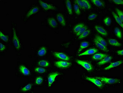 Immunofluorescent analysis of Hela cells using CSB-PA02655A0Rb at dilution of 1:100 and Alexa Fluor 488-congugated AffiniPure Goat Anti-Rabbit IgG(H+L)