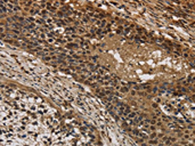 The image on the left is immunohistochemistry of paraffin-embedded Human cervical cancer tissue using CSB-PA299855(CYBA Antibody) at dilution 1/20, on the right is treated with synthetic peptide. (Original magnification: ×200)