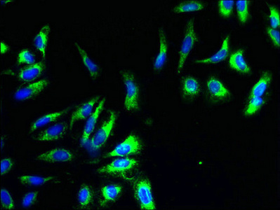 Immunofluorescent analysis of Hela cells using CSB-PA01515A0Rb at dilution of 1:100 and Alexa Fluor 488-congugated AffiniPure Goat Anti-Rabbit IgG(H+L)