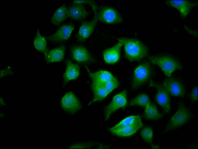 Immunofluorescence staining of A549 cells with CSB-PA748722LA01HU at 1:100, counter-stained with DAPI. The cells were fixed in 4% formaldehyde, permeabilized using 0.2% Triton X-100 and blocked in 10% normal Goat Serum. The cells were then incubated with the antibody overnight at 4°C. The secondary antibody was Alexa Fluor 488-congugated AffiniPure Goat Anti-Rabbit IgG(H+L).