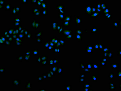 Immunofluorescence staining of Hela cells with CSB-PA621969LA21HU at 1:100, counter-stained with DAPI. The cells were fixed in 4% formaldehyde and blocked in 10% normal Goat Serum. The cells were then incubated with the antibody overnight at 4°C. The secondary antibody was Alexa Fluor 488-congugated AffiniPure Goat Anti-Rabbit IgG(H+L).